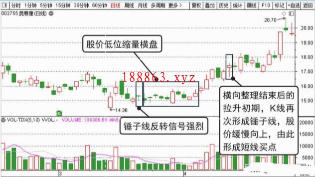 由图可知,之后股价在低位进入横盘整理阶段,成交量不断缩量,充分显示出了市场做空动力的逐步衰竭。之后股价渐渐反转,在横盘整理结束后的拉升初期再次形成了锤子线形态,于是可以判断出市场短线上涨,投资者应抓住时机短线买入获利。