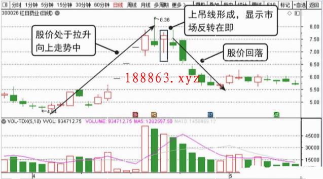 2、上吊线:市场在屡屡做多后,买卖双方力量达到平衡,在一个交易日内,多方努力将价格上推,创出当天新高后,并无心维持高位,价格大幅下跌,卖方力量势不可挡,多日来卖方被压制的能量瞬间释放,价格大力下挫,但当天收市价仍处于较高位置,接近最高价,形成实体部分相当小。上吊线,一般处于上扬市中,表明市场可能见顶,阴线比阳线效果更好。